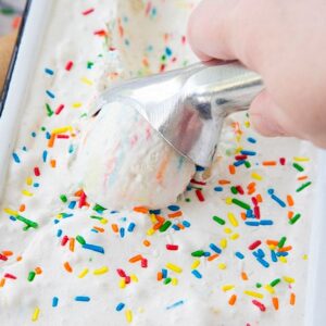 - Mix. Gently stir collectively non-dairy whipped topping and sweetened condensed milk the utilization of a spatula. Fold within the chopped up cake items and sprinkles. Don’t over-mix since the sprinkles will halt up melting into the ice cream.